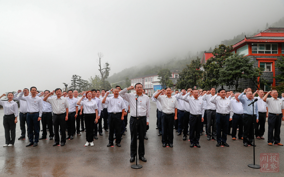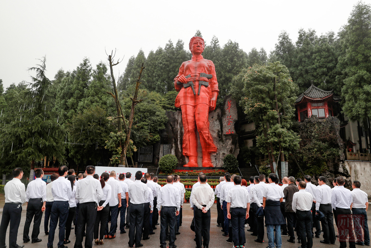 9月19日,革命老区、“红岩”故里四川省广安市华蓥山虽然秋雨纷飞、山雾缭绕,但在“双枪老太婆”大型塑像前,来自华蓥市的党员领导干部高吭激越的《入党誓词》,打破沉寂,在大山中久久回荡。