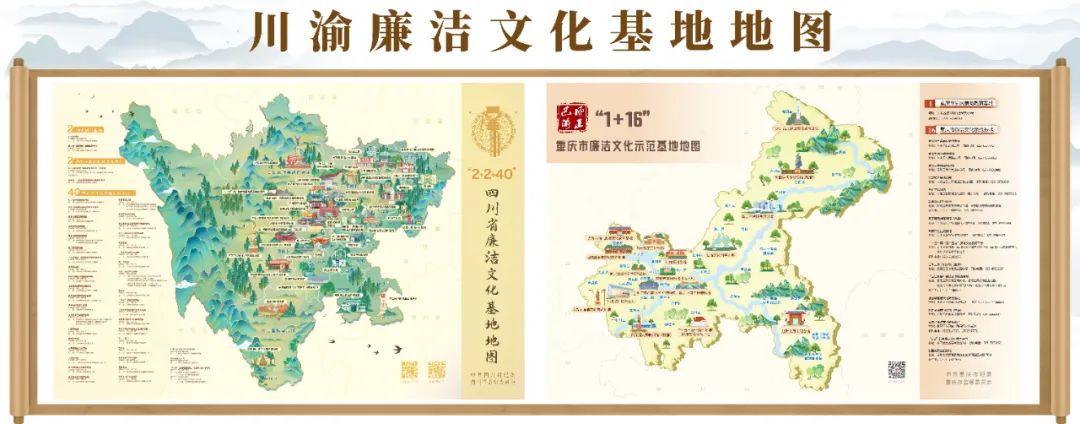 该幅地图涵盖四川省“2个核心基地+2个分层分类教育展示点+40个廉洁文化基地”廉洁文化基地和重庆市“1个党风廉政教育基地+16个廉洁文化示范基地”廉洁文化示范基地,以中国传统青绿山水风为基调,将各基地具有辨识度的建筑手绘呈现于尺素之间。